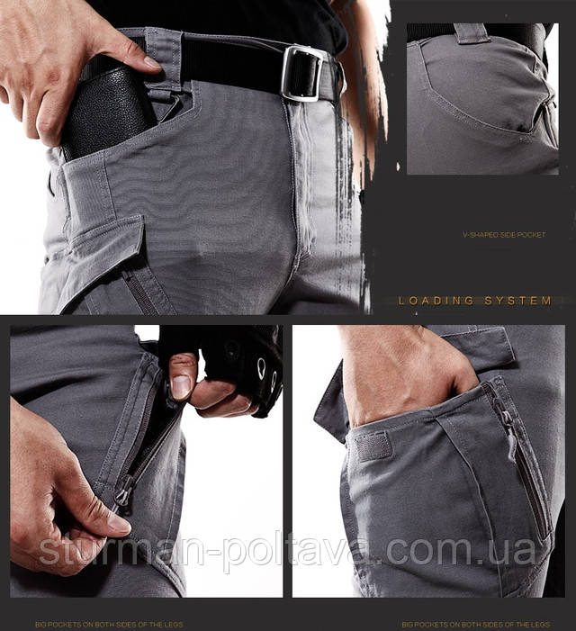 Два передніх бічних прорізні кишені знаходяться під нахилом і мають вигнуту форму, що забезпечує комфортне витяг спорядження з кишені. Два бічних кишені на стегнах мають нахил, що забезпечує їх максимальну місткість.