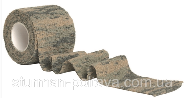 Камуфльована стрічка являє собою підвид еластичного бинта в маскувальному забарвленні. Вона прекрасно тягнеться і має здатність "липнути" до предметів і самої собі. Для "приклеювання" досить лише трохи розтягнути шматок тканини, що тягнеться, й обернути його нахлистом навколо потрібної речі. Завдяки безлічі маленьких гумочок і високій еластичності матеріалу, камуфляжна стрічка прекрасно розтягується: одного рулону вистачить, щоб покрити площу, що в 90 разів перевищує його товщину!