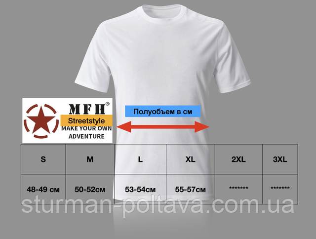 Полуобъем потрібно вимірювати в см і по середині футболки